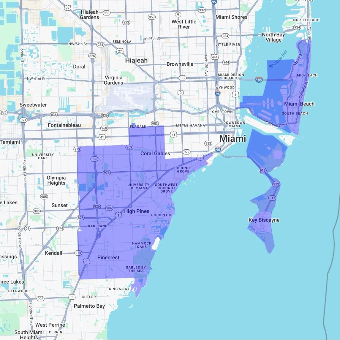Coral Gables, Coconut Grove, Pinecrest, South Miami, High Pines, Key Biscayne and Miami Beach.